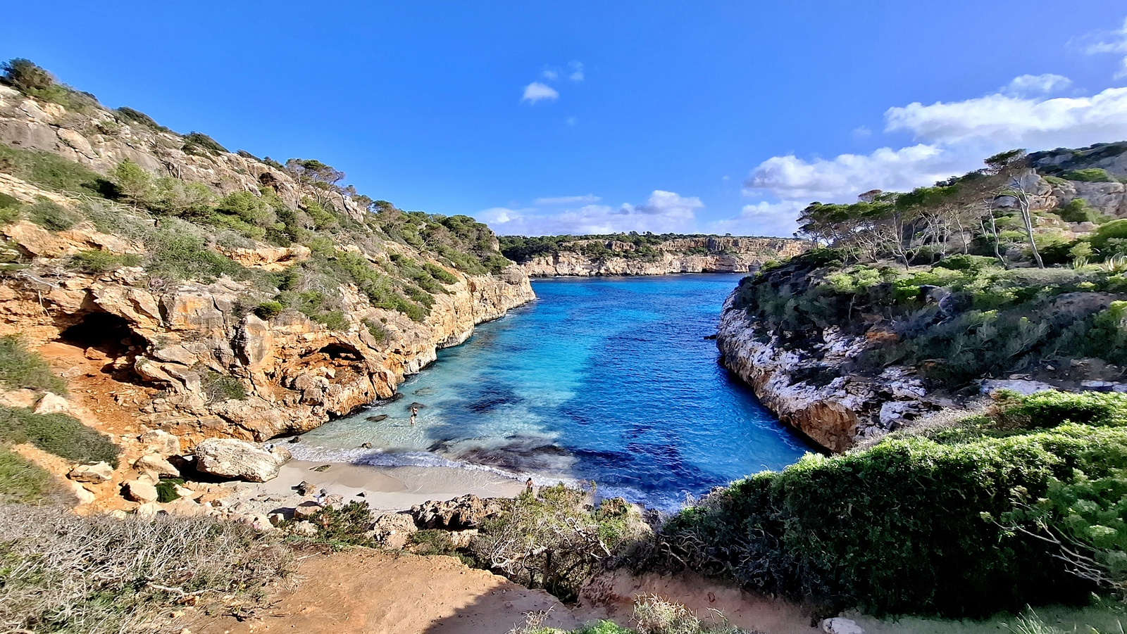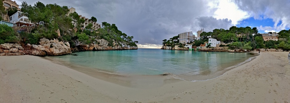Am Morgen strahlt die Sonne vom stahlblauen Himmel. So nutzen wir das herrliche Wetter und brechen in Richtung Südosten auf. Nach einem Abstecher nach Ses Salines fahren wir zur nahen Caló des Moro. Während man in der Saison hierher nur per Shuttlebus oder zu Fuß kommt, können wir mit dem Auto bis zur Bilderbuchbucht, welche das Ziel unzähliger Instagramer ist, fahren. Durch das geschützte Ufergebiet gehen wir entlang der angelegten Wege zur Bucht, die wirklich traumhaft ist. Dann geht es noch das kurze Stück zur Nachbarbucht Cala s’Almunia, bevor wir dann hinüber zur Cala Llombards fahren. Auch hier genießen wir die Sonne und den menschenleeren Strand. Nur ein paar hundert Meter gegenüber liegt Es Pontas. Da wir aber mit dem Auto hier sind, dauert die Fahrt fast 20 Minuten bis dahin. Nach dem Besuch des imposanten Felsentores fahren wir hinunter zur Cala Santanyi. Auch hier herrscht nachsaisonale Ruhe und wir sind fast die Einzigen am Strand. Unverzichtbar bei unseren Mallorcaaufenthalten ist unser nächster Zwischenstopp - die Cala Mondrago. Die Bucht S’Amarador ist immer eines der Highlights und wir nutzen das noch sonnige Wetter, um in das immer noch mit 22°C Wassertemperatur angenehm temperierte Mittelmeer zu springen. Dann geht unsere Fahrt durch den Südosten weiter in Richtung Cala d'Or. Via Santanyi, S’Alqueria Blanca und Portopetro fahren wir zur Cala Esmeralda. In Cala d'Or ist auch schon fast alles "hochgeklappt". Zumindest die größeren Resorts haben alle zu nur einige wenige Privatquartiere wirken noch belebt. Dann wird der Himmel zunehmend dunkler und das vorhergesagte Regenwetter setzt ein. Bei Nieselregen fahren wir weiter in Richtung Cala Murada. Nicht nur, weil das Wetter nicht ideal ist, sondern auch aufgrund der Szenerie, die wir hier erleben, nehmen wir schnell Reißaus. Es mag sein, dass unser Eindruck subjektiv ist aber hier vereinigen sich alle negativen Klischees der Insel und wir stellen uns die Frage, wer hier freiwillig eines dieser Hotels bucht, welche meistens ein Fall für die Abrissbirne sind. Daher fahren wir schnell weiter in angenehmere Gefilde der Insel. Via Felanitx und Petra geht unsere Fahrt zurück zur Agroturismo Roqueta. Wir hoffen, dass der Wetterbericht recht behält und morgen das Wetter wieder sonnig ist.