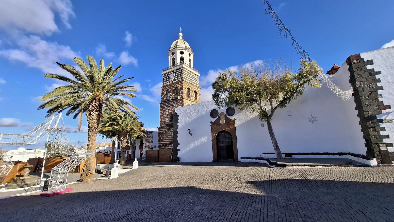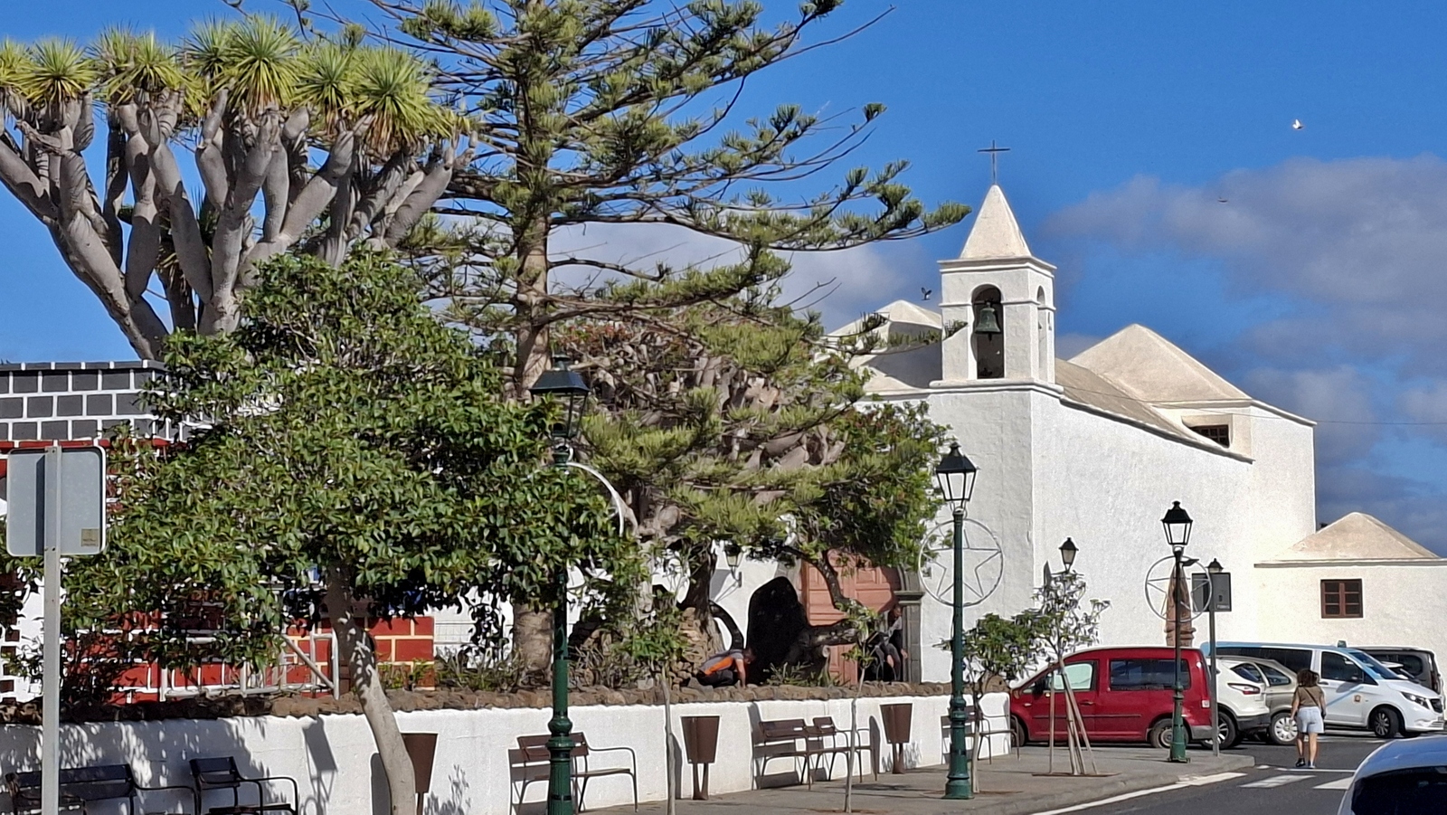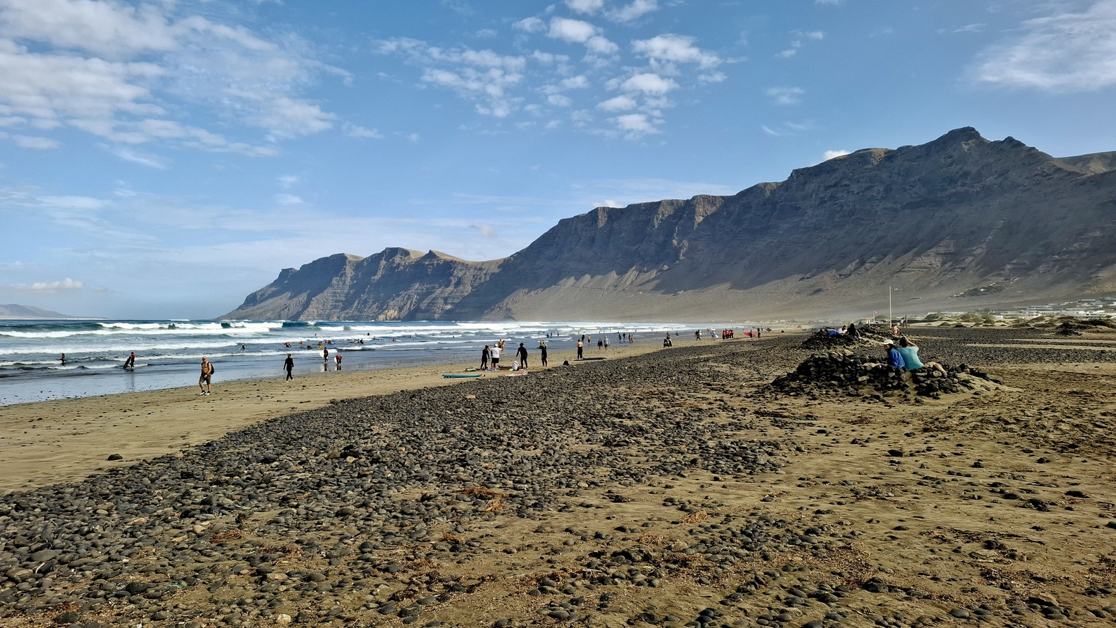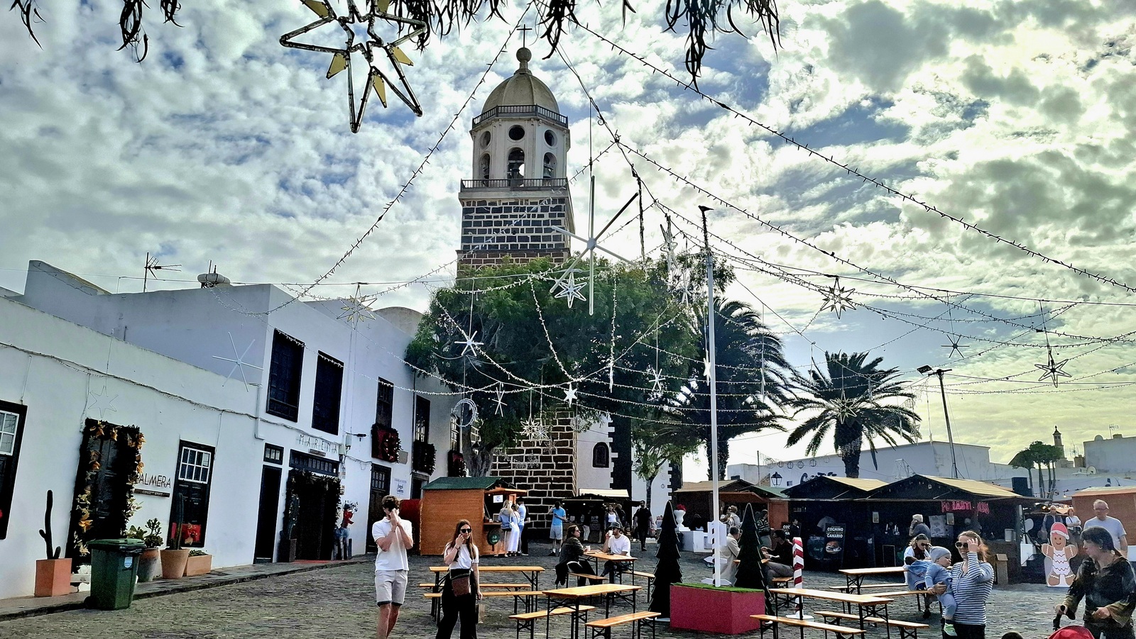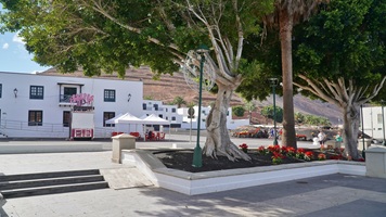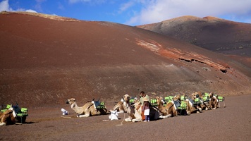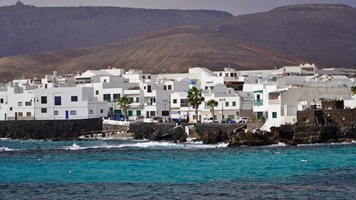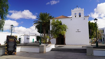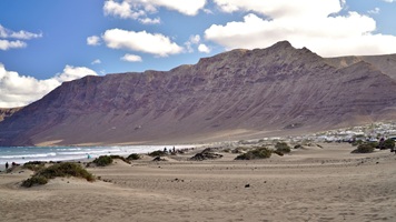 Natürlich findet unser Frühstück auch heute wieder auf Terrassien statt. Danach starten wir in Richtung Teguise, wo wir nach unserer Ankunft durch die ehemalige Inselhauptstadt schlendern. Hier wird gerade der Weihnachtsmarkt aufgebaut und trotzdem liegt der kleine Ort mit seinen vielen kolonialen Häusern am Morgen noch recht verschlafen da. Teguise hat viel Charme und so ist es immer ein Pflichtbesuch, wenn wir hier auf der Insel sind. Anschließend wollten wir eigentlich hinauf zum Castillo de Santa Bárbara, was aber leider heute geschlossen hat. So fahren wir ein paar Kilometer weiter hinunter an die Nordwestküste nach Famara. Hier bummeln wir am weiten Strand vor imposanter Felskulisse und schauen den vielen Surfern zu, welche hier zugange sind. Gegenüber liegen auch La Graciosa, Montaña Clara und Alegranza und runden die Szenerie ab. Dann fahren wir weiter via Soo, La Santa und Tinajo in Richtung Timanfaya. Nach einem kurzen Stopp am Besucherzentrum fahren wir durch die Lavalandschaft des Nationalparks, welche immer wieder sehr beeindruckend ist. Da wir zuletzt mehrmals dort waren, geht heute die Fahrt weiter zur Kamelstation, wo wir ebenfalls nur kurz halten. Der Kamelritt passt auch nicht mehr so recht in die heutige Zeit und es gibt auch wenig Interessenten für dieses "Vergnügen". Dann führt uns der weitere Weg ganz in den Inselsüden nach Playa Blanca. Wir bummeln entlang der Promenade wo wir zwar das warme Wetter und den Sonnenschein genießen, uns dann aber doch zur Weiterfahrt entschließen, da sich der Ort seit unserem ersten Besuch vor fast 30 Jahren doch sehr touristisch verändert hat. Dann zieht es uns nach El Golfo, wo wir in einem der dortigen Lokale essen wollen. Unsere Wahl fällt wie schon zuletzt auf die Casa Rafa, wo wir allerdings aufgrund der hohen Nachfrage fast eine Stunde warten müssen, bevor wir einen Tisch ergattern. Nachdem wir sehr gut gegessen haben, fahren wir im goldgelben Licht der Abendsonne wieder durch den Timanfaya N.P. und La Geria zurück in die Casa Isabel.