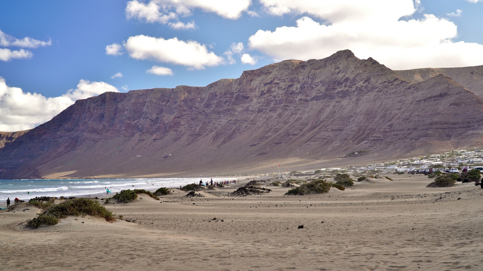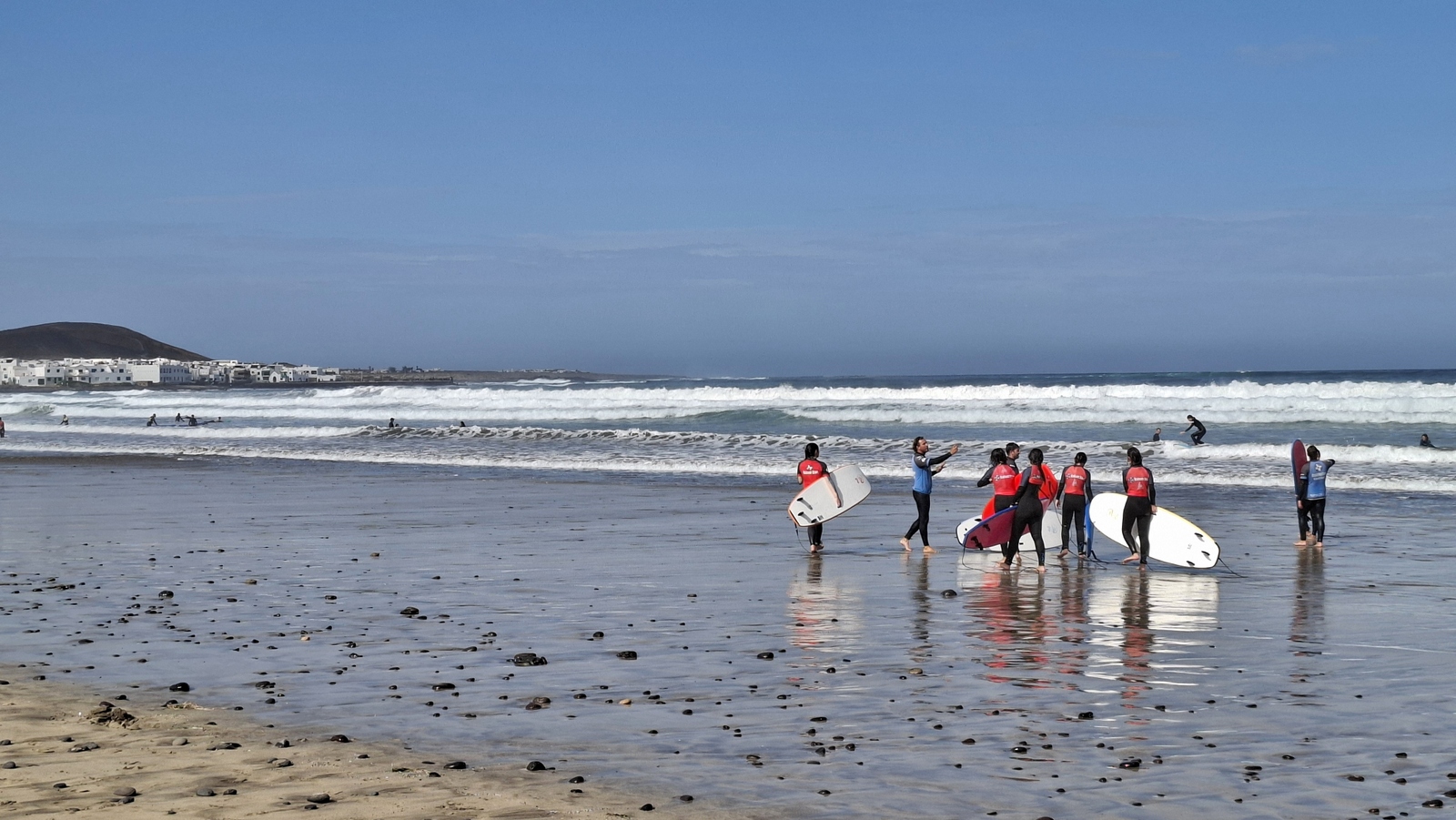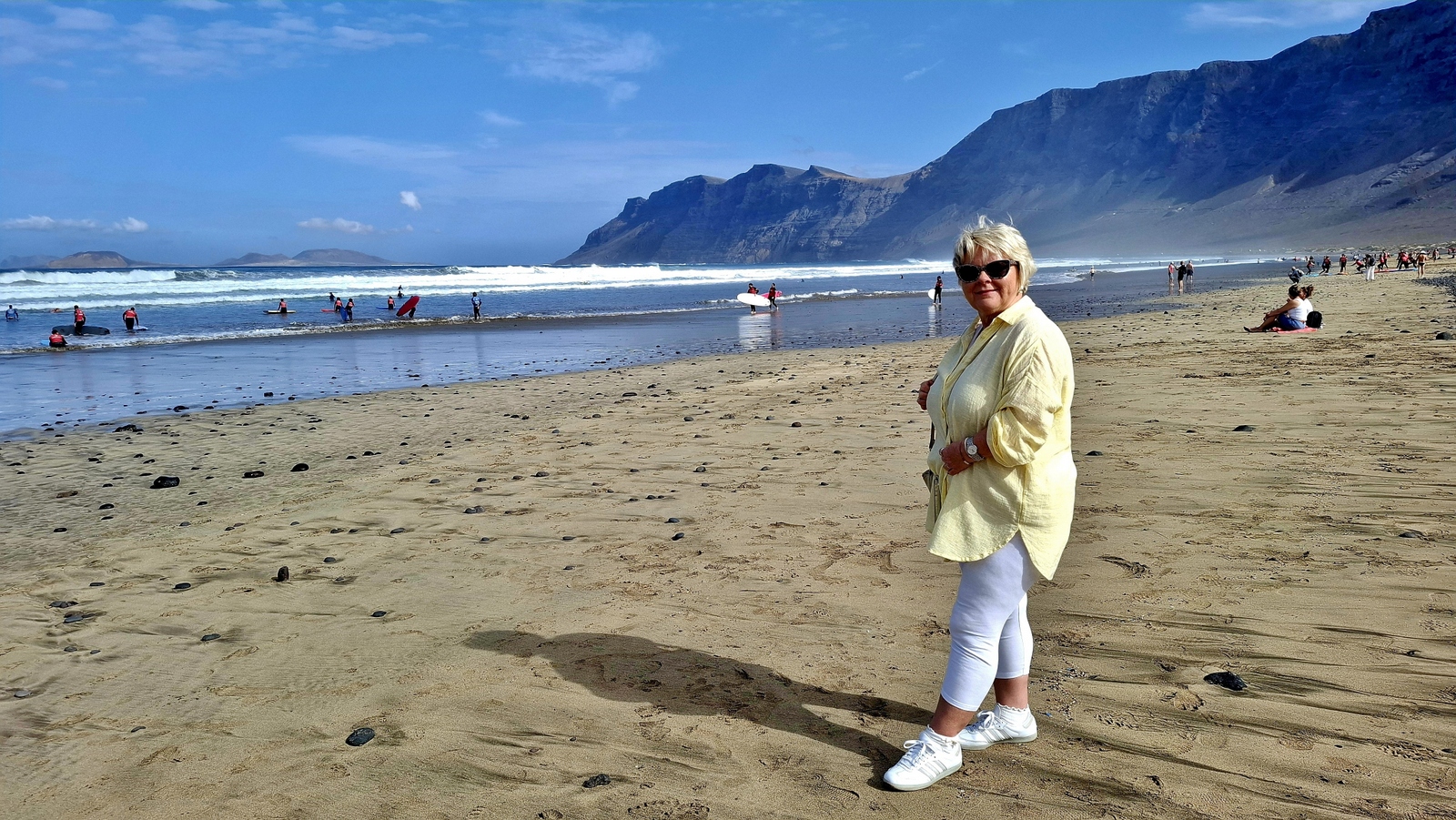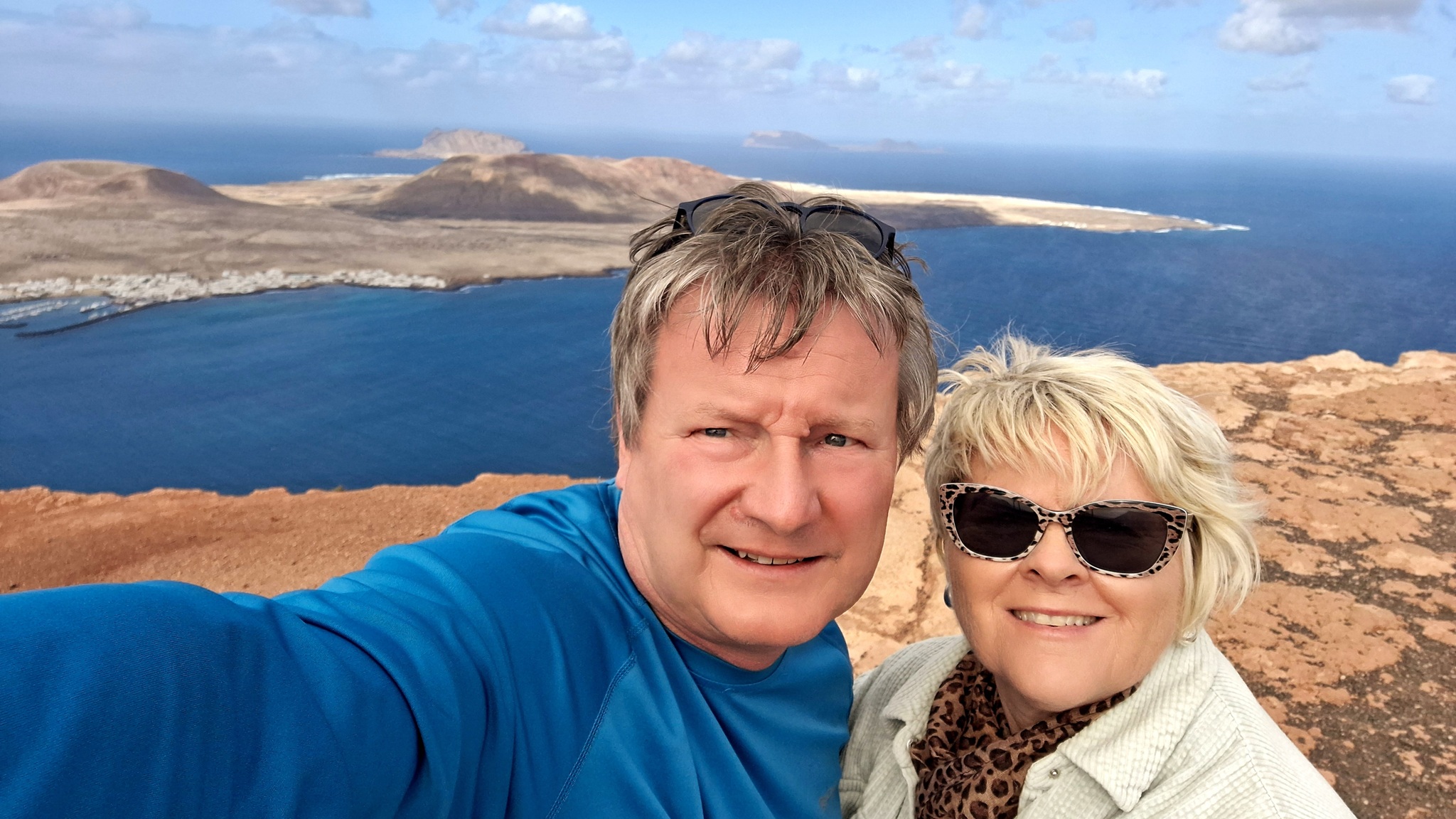 Natürlich findet unser Frühstück auch heute wieder auf Terrassien statt. Danach starten wir in Richtung Teguise, wo wir nach unserer Ankunft durch die ehemalige Inselhauptstadt schlendern. Hier wird gerade der Weihnachtsmarkt aufgebaut und trotzdem liegt der kleine Ort mit seinen vielen kolonialen Häusern am Morgen noch recht verschlafen da. Teguise hat viel Charme und so ist es immer ein Pflichtbesuch, wenn wir hier auf der Insel sind. Anschließend wollten wir eigentlich hinauf zum Castillo de Santa Bárbara, was aber leider heute geschlossen hat. So fahren wir ein paar Kilometer weiter hinunter an die Nordwestküste nach Famara. Hier bummeln wir am weiten Strand vor imposanter Felskulisse und schauen den vielen Surfern zu, welche hier zugange sind. Gegenüber liegen auch La Graciosa, Montaña Clara und Alegranza und runden die Szenerie ab. Dann fahren wir weiter via Soo, La Santa und Tinajo in Richtung Timanfaya. Nach einem kurzen Stopp am Besucherzentrum fahren wir durch die Lavalandschaft des Nationalparks, welche immer wieder sehr beeindruckend ist. Da wir zuletzt mehrmals dort waren, geht heute die Fahrt weiter zur Kamelstation, wo wir ebenfalls nur kurz halten. Der Kamelritt passt auch nicht mehr so recht in die heutige Zeit und es gibt auch wenig Interessenten für dieses "Vergnügen". Dann führt uns der weitere Weg ganz in den Inselsüden nach Playa Blanca. Wir bummeln entlang der Promenade wo wir zwar das warme Wetter und den Sonnenschein genießen, uns dann aber doch zur Weiterfahrt entschließen, da sich der Ort seit unserem ersten Besuch vor fast 30 Jahren doch sehr touristisch verändert hat. Dann zieht es uns nach El Golfo, wo wir in einem der dortigen Lokale essen wollen. Unsere Wahl fällt wie schon zuletzt auf die Casa Rafa, wo wir allerdings aufgrund der hohen Nachfrage fast eine Stunde warten müssen, bevor wir einen Tisch ergattern. Nachdem wir sehr gut gegessen haben, fahren wir im goldgelben Licht der Abendsonne wieder durch den Timanfaya N.P. und La Geria zurück in die Casa Isabel.