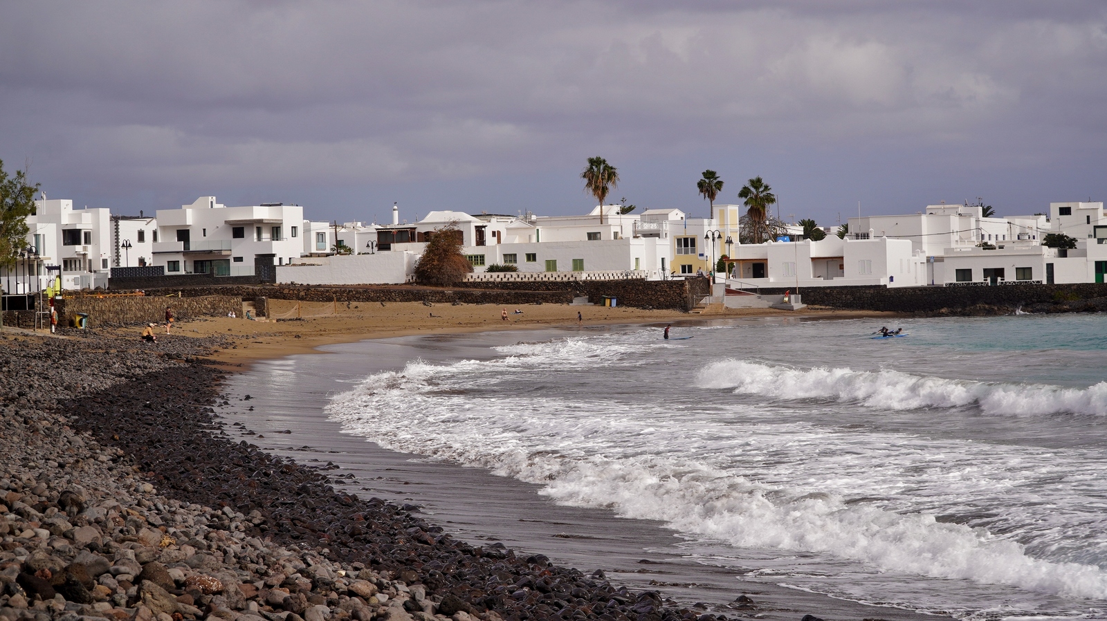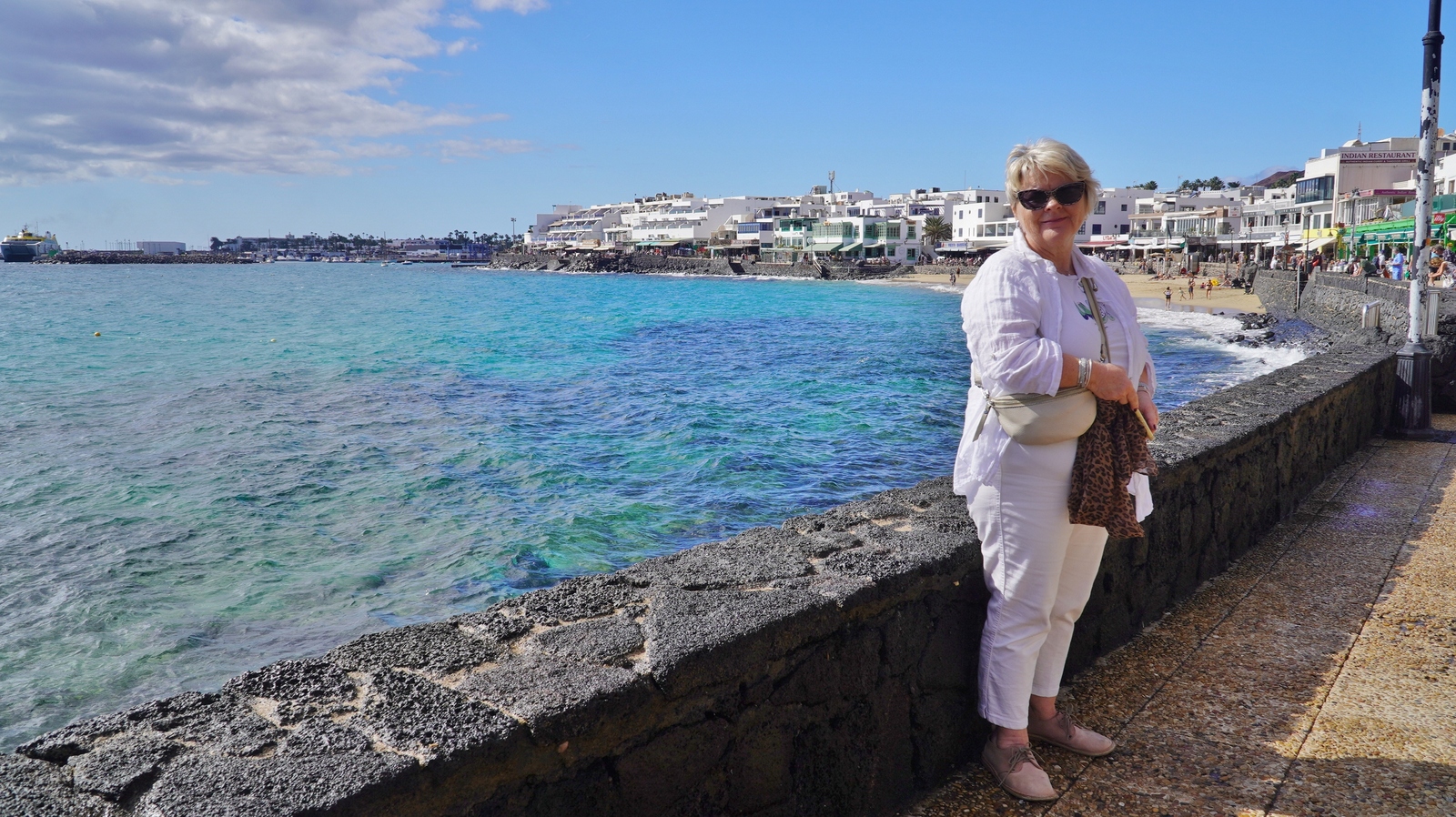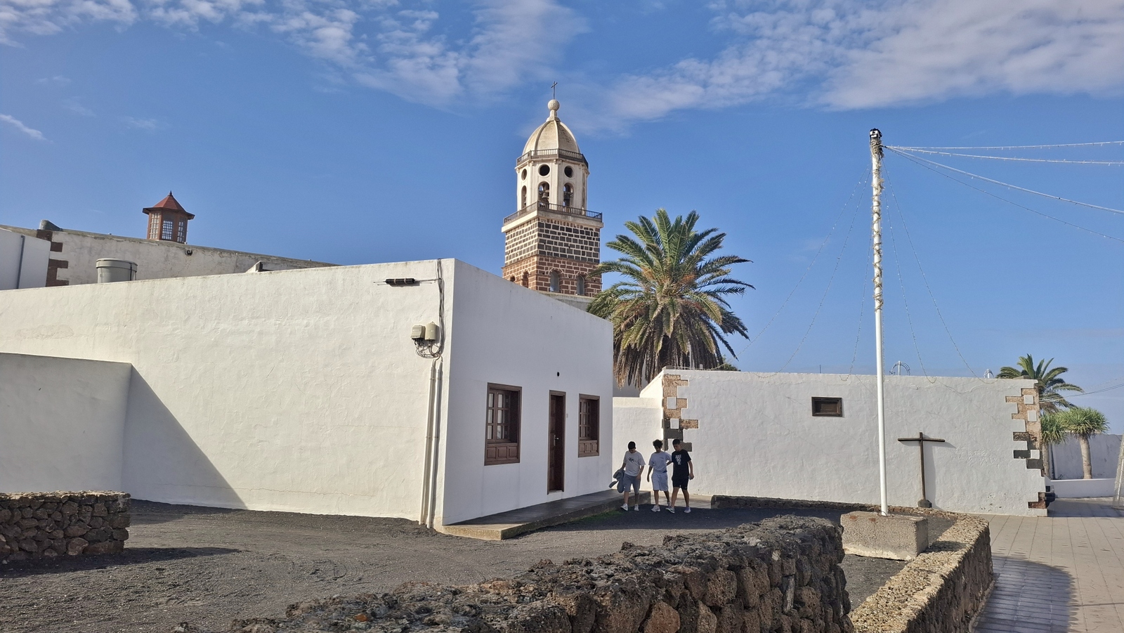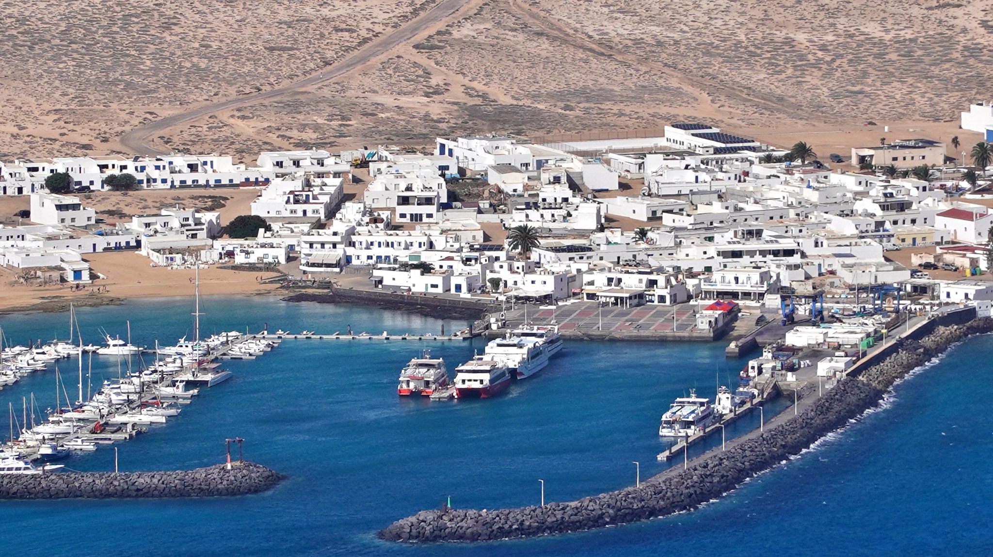 Natürlich findet unser Frühstück auch heute wieder auf Terrassien statt. Danach starten wir in Richtung Teguise, wo wir nach unserer Ankunft durch die ehemalige Inselhauptstadt schlendern. Hier wird gerade der Weihnachtsmarkt aufgebaut und trotzdem liegt der kleine Ort mit seinen vielen kolonialen Häusern am Morgen noch recht verschlafen da. Teguise hat viel Charme und so ist es immer ein Pflichtbesuch, wenn wir hier auf der Insel sind. Anschließend wollten wir eigentlich hinauf zum Castillo de Santa Bárbara, was aber leider heute geschlossen hat. So fahren wir ein paar Kilometer weiter hinunter an die Nordwestküste nach Famara. Hier bummeln wir am weiten Strand vor imposanter Felskulisse und schauen den vielen Surfern zu, welche hier zugange sind. Gegenüber liegen auch La Graciosa, Montaña Clara und Alegranza und runden die Szenerie ab. Dann fahren wir weiter via Soo, La Santa und Tinajo in Richtung Timanfaya. Nach einem kurzen Stopp am Besucherzentrum fahren wir durch die Lavalandschaft des Nationalparks, welche immer wieder sehr beeindruckend ist. Da wir zuletzt mehrmals dort waren, geht heute die Fahrt weiter zur Kamelstation, wo wir ebenfalls nur kurz halten. Der Kamelritt passt auch nicht mehr so recht in die heutige Zeit und es gibt auch wenig Interessenten für dieses "Vergnügen". Dann führt uns der weitere Weg ganz in den Inselsüden nach Playa Blanca. Wir bummeln entlang der Promenade wo wir zwar das warme Wetter und den Sonnenschein genießen, uns dann aber doch zur Weiterfahrt entschließen, da sich der Ort seit unserem ersten Besuch vor fast 30 Jahren doch sehr touristisch verändert hat. Dann zieht es uns nach El Golfo, wo wir in einem der dortigen Lokale essen wollen. Unsere Wahl fällt wie schon zuletzt auf die Casa Rafa, wo wir allerdings aufgrund der hohen Nachfrage fast eine Stunde warten müssen, bevor wir einen Tisch ergattern. Nachdem wir sehr gut gegessen haben, fahren wir im goldgelben Licht der Abendsonne wieder durch den Timanfaya N.P. und La Geria zurück in die Casa Isabel.