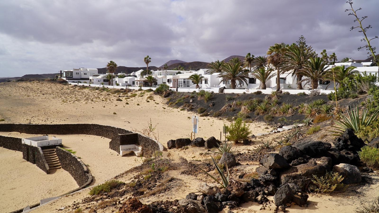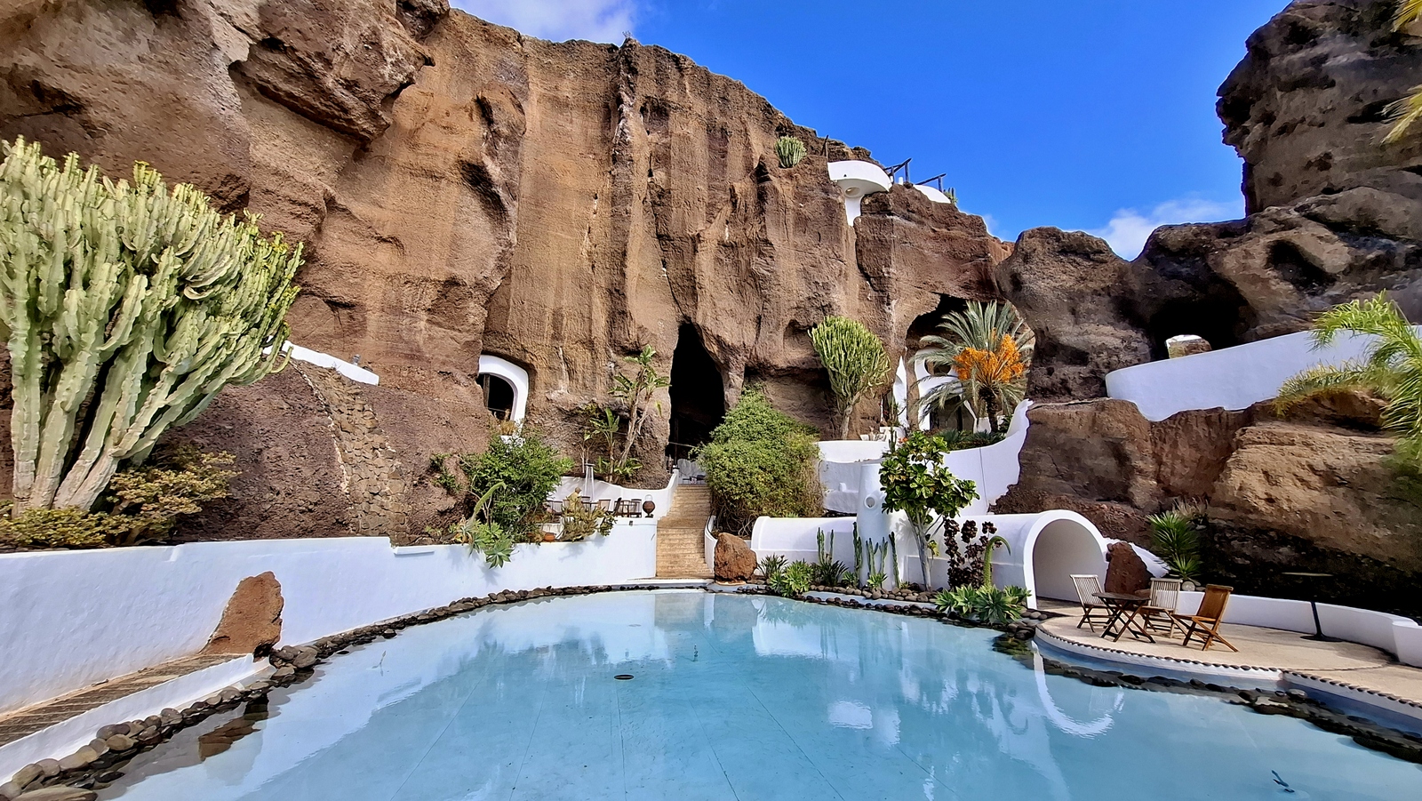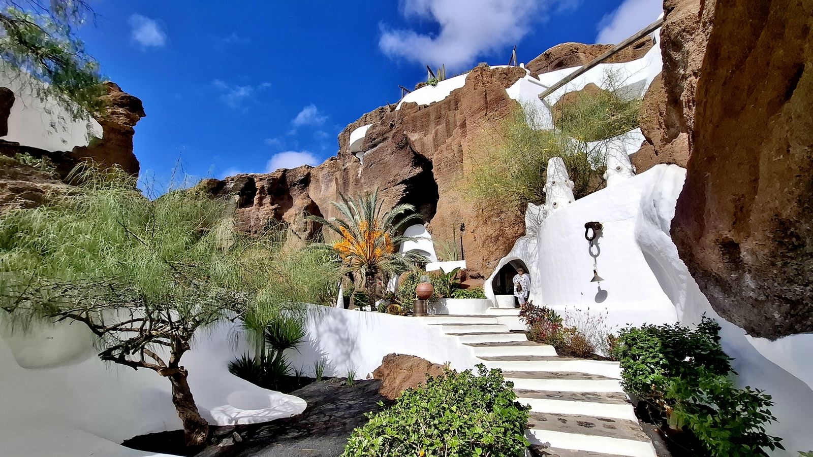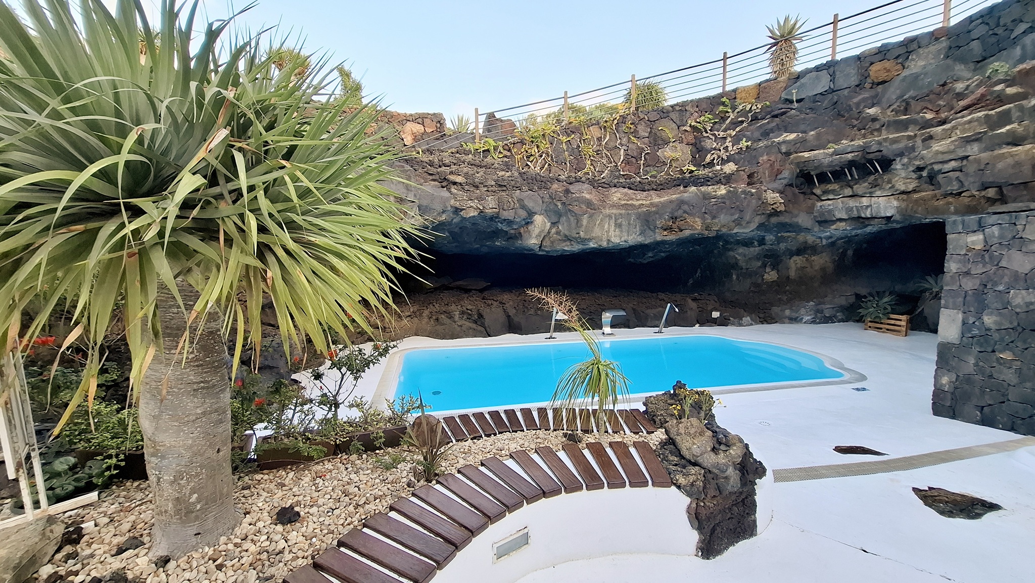 In der Nacht hat es geregnet, so dass zwar unser Frühstück auf Terrassien stattfinden kann, wir jedoch unseren ursprünglichen Plan zu einen Ausflug auf die Nachbarinsel La Graciosa fallen lassen. Dann fahren wir via Tahiche zur Costa Teguise. Hier hatten wir im Jahr 2000 im Hotel Neptuno unser Quartier und wir wollen uns einfach mal umschauen, was sich in den letzten 25 Jahren hier getan hat. Nach einem ersten kurzen Rundgang kommen wir aber recht schnell zu der Erkenntnis, dass das hier nicht mehr nach unseren Gusto ist. So fahren wir weiter nach Norden nach Arrieta, wo wir an der Playa de la Garita einen kurzen Fotostopp einlegen. Dann geht die Fahrt weiter durch Arrieta bis wir auf der Uferstraße die nächste kleine Ortschaft Punta Mujeres erreichen. Nach einer kurzen Pause an der Muelle des Mini-Fischerhafens fahren wir zurück in Richtung Süden, um via Mala in die kleine Urbanización Charco del Palo zu erreichen. Die Besonderheit des kleinen Weilers ist, dass es ein reines Nudistendorf ist. Hier gibt es viele schöne Häuschen, wenn auch die Bademöglichkeiten auf einige Felsenbuchten beschränkt sind. Trotzdem hat der Ort mit seiner dünenartigen Umgebung einiges zu bieten. Wir fahren wir durch Guatiza und vorbei am Jardin de Cactus. Dann erreichen wir unser nächstes Ziel, das Museo LagOmar in Nazaret. Hier besichtigen wir das in den Felsen gebaute ehemalige Haus des bekannten Schauspielers Omar Sharif, welches dieser beim Bridgespiel einfach mal so verzockt hat. So kommen wir in den Genuss, diese tolle Anwesen, welches heute Museum ist, besichtigen zu können. Nach dem Besuch Machen wir noch einen Abstecher zur Fundación César Manrique, welche sich im ehemaligen Wohnhaus des bekanntesten Inselkünstlers befindet. Da wir in den letzten Jahren schon mehrmals hier waren, verzichten wir auf einen Besuch, wobei wir aber allen Touristen, welche das erste Mal auf der Insel sind, ein Besuch dringend empfehlen. Auf der Rückfahrt zu unserer Unterkunft in Mozaga machen wir noch einen kurzen Stopp am Monumento al Campesino. Das wurde ebenfalls von César Manrique erschaffen und bietet wirklich tolle Fotomotive. Zurück in der Finca Isabel springen wir noch einmal kurz in den eiskalten Pool und wärmen uns dann in der Abendsonne auf unserer Terrasse.