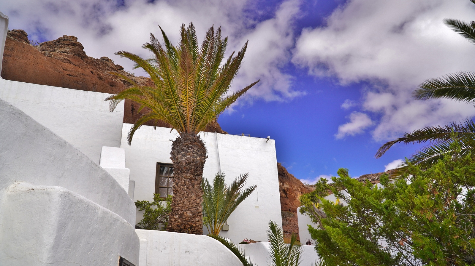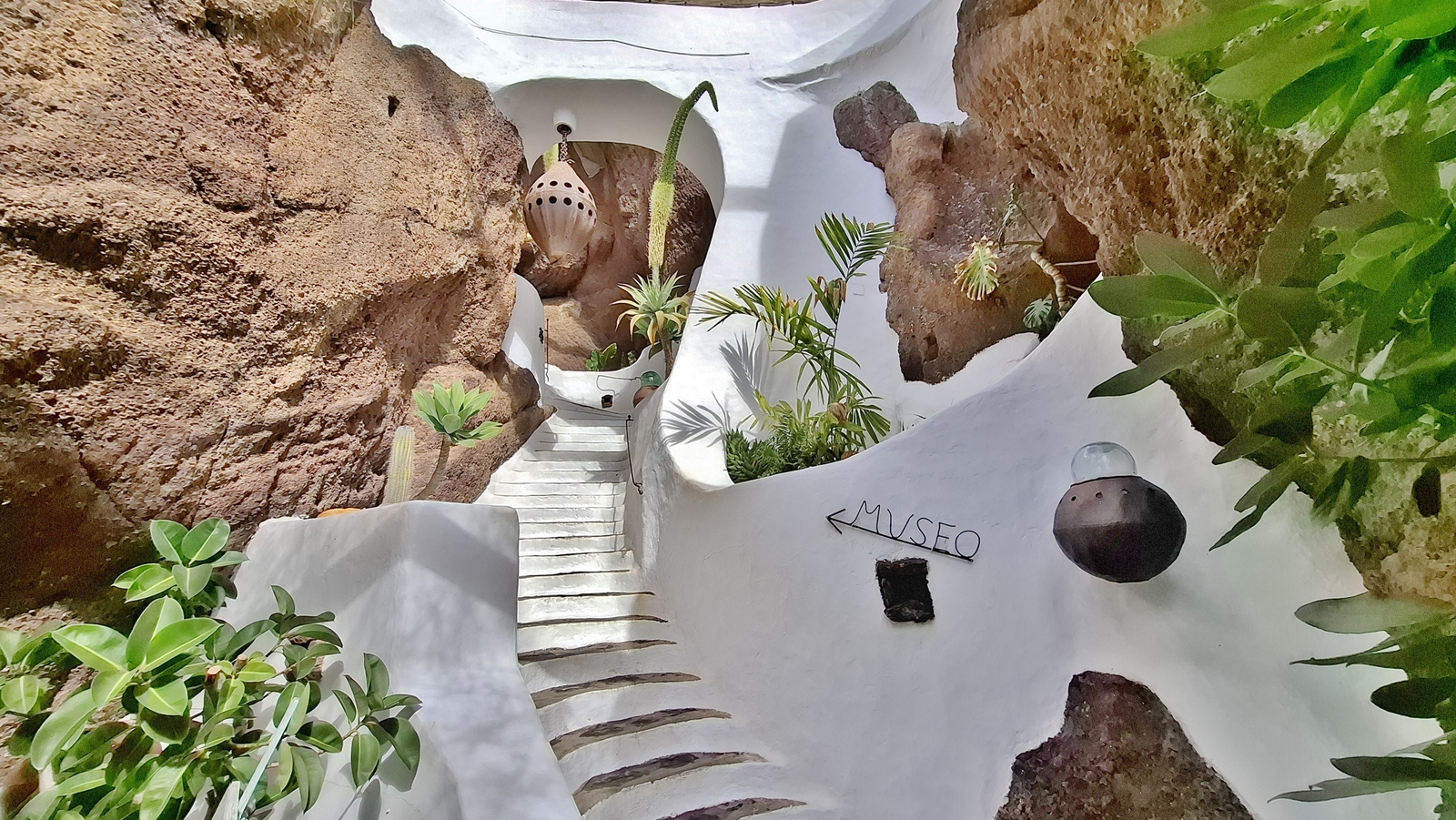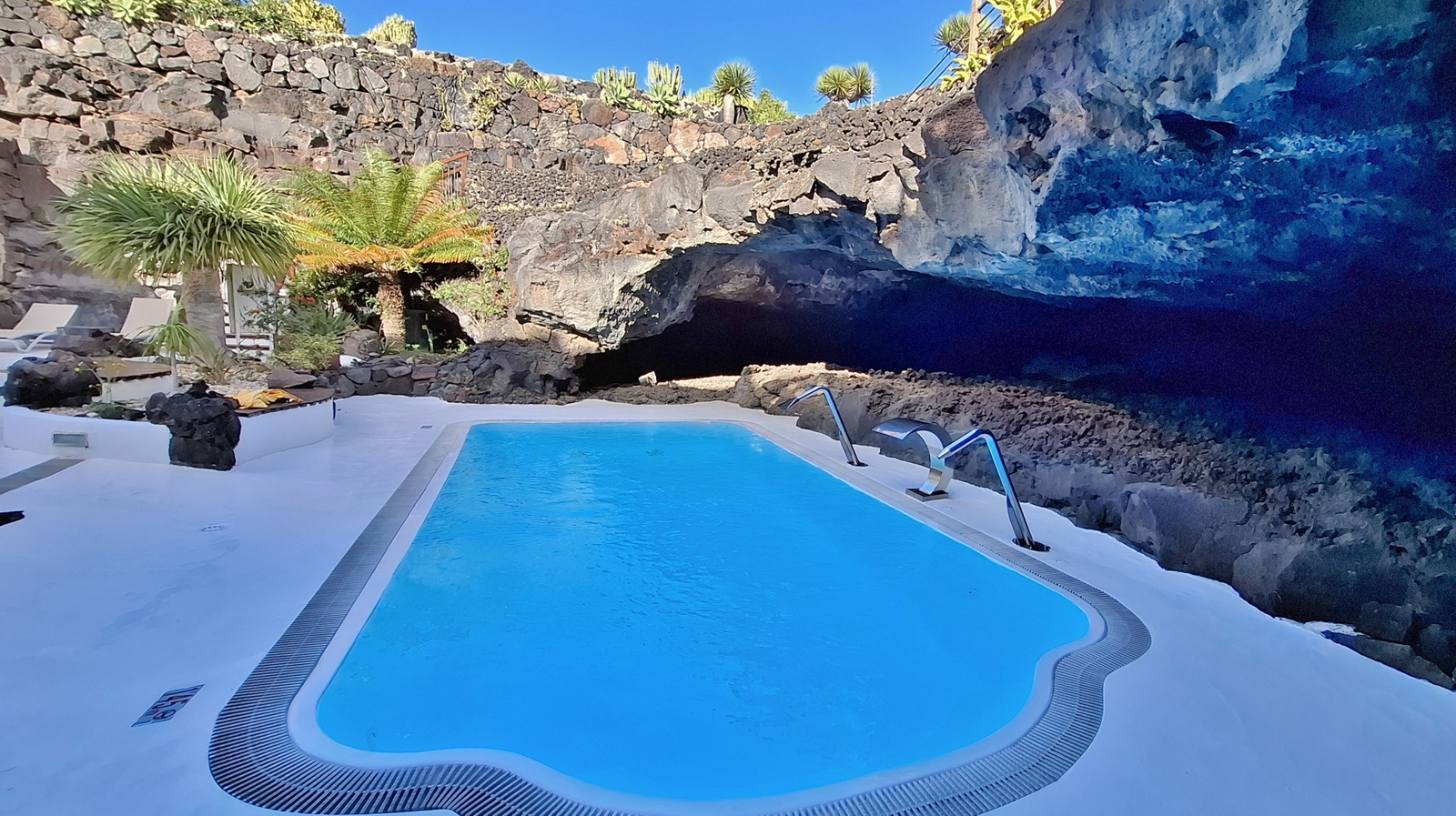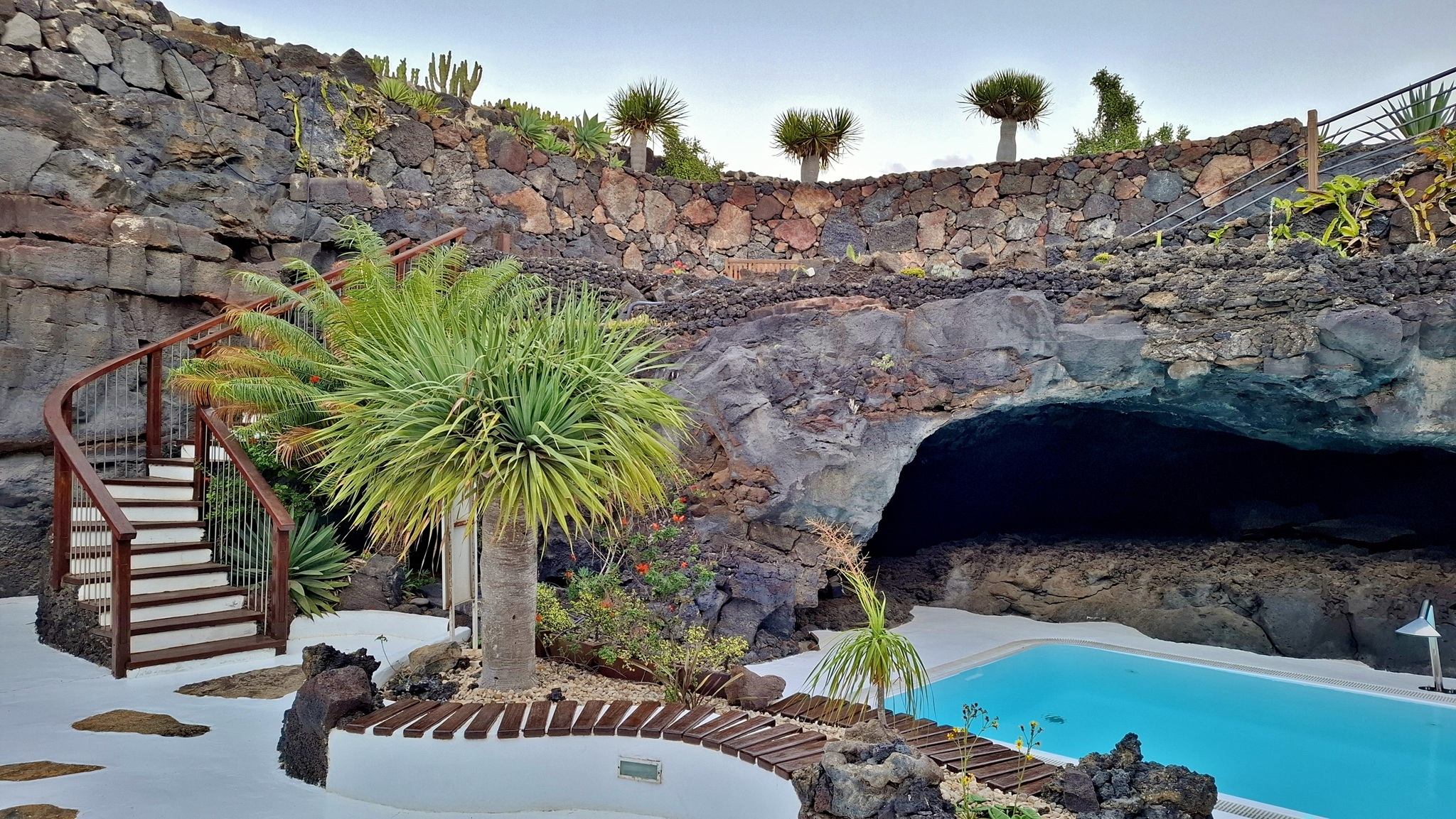 In der Nacht hat es geregnet, so dass zwar unser Frühstück auf Terrassien stattfinden kann, wir jedoch unseren ursprünglichen Plan zu einen Ausflug auf die Nachbarinsel La Graciosa fallen lassen. Dann fahren wir via Tahiche zur Costa Teguise. Hier hatten wir im Jahr 2000 im Hotel Neptuno unser Quartier und wir wollen uns einfach mal umschauen, was sich in den letzten 25 Jahren hier getan hat. Nach einem ersten kurzen Rundgang kommen wir aber recht schnell zu der Erkenntnis, dass das hier nicht mehr nach unseren Gusto ist. So fahren wir weiter nach Norden nach Arrieta, wo wir an der Playa de la Garita einen kurzen Fotostopp einlegen. Dann geht die Fahrt weiter durch Arrieta bis wir auf der Uferstraße die nächste kleine Ortschaft Punta Mujeres erreichen. Nach einer kurzen Pause an der Muelle des Mini-Fischerhafens fahren wir zurück in Richtung Süden, um via Mala in die kleine Urbanización Charco del Palo zu erreichen. Die Besonderheit des kleinen Weilers ist, dass es ein reines Nudistendorf ist. Hier gibt es viele schöne Häuschen, wenn auch die Bademöglichkeiten auf einige Felsenbuchten beschränkt sind. Trotzdem hat der Ort mit seiner dünenartigen Umgebung einiges zu bieten. Wir fahren wir durch Guatiza und vorbei am Jardin de Cactus. Dann erreichen wir unser nächstes Ziel, das Museo LagOmar in Nazaret. Hier besichtigen wir das in den Felsen gebaute ehemalige Haus des bekannten Schauspielers Omar Sharif, welches dieser beim Bridgespiel einfach mal so verzockt hat. So kommen wir in den Genuss, diese tolle Anwesen, welches heute Museum ist, besichtigen zu können. Nach dem Besuch Machen wir noch einen Abstecher zur Fundación César Manrique, welche sich im ehemaligen Wohnhaus des bekanntesten Inselkünstlers befindet. Da wir in den letzten Jahren schon mehrmals hier waren, verzichten wir auf einen Besuch, wobei wir aber allen Touristen, welche das erste Mal auf der Insel sind, ein Besuch dringend empfehlen. Auf der Rückfahrt zu unserer Unterkunft in Mozaga machen wir noch einen kurzen Stopp am Monumento al Campesino. Das wurde ebenfalls von César Manrique erschaffen und bietet wirklich tolle Fotomotive. Zurück in der Finca Isabel springen wir noch einmal kurz in den eiskalten Pool und wärmen uns dann in der Abendsonne auf unserer Terrasse.
