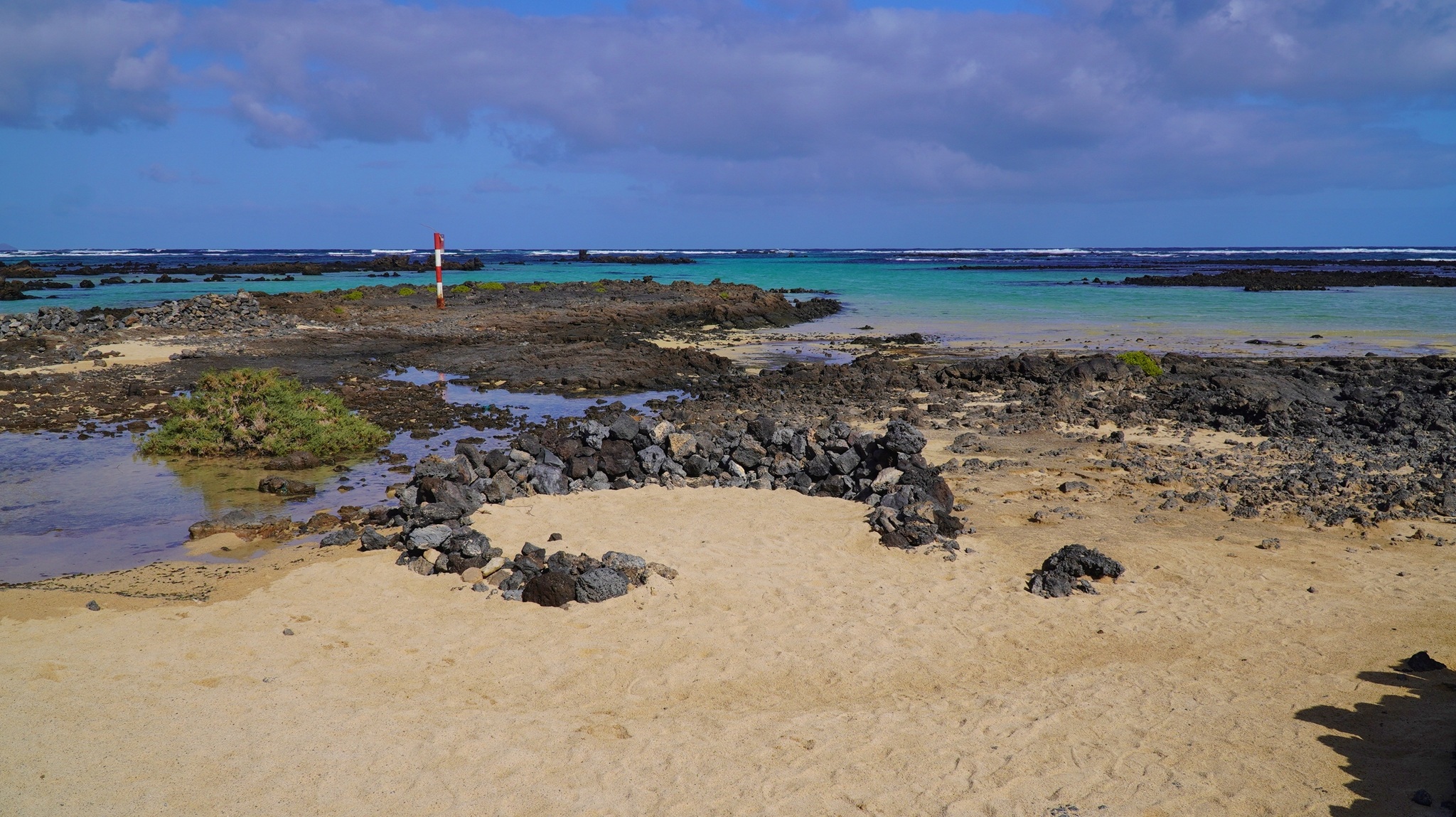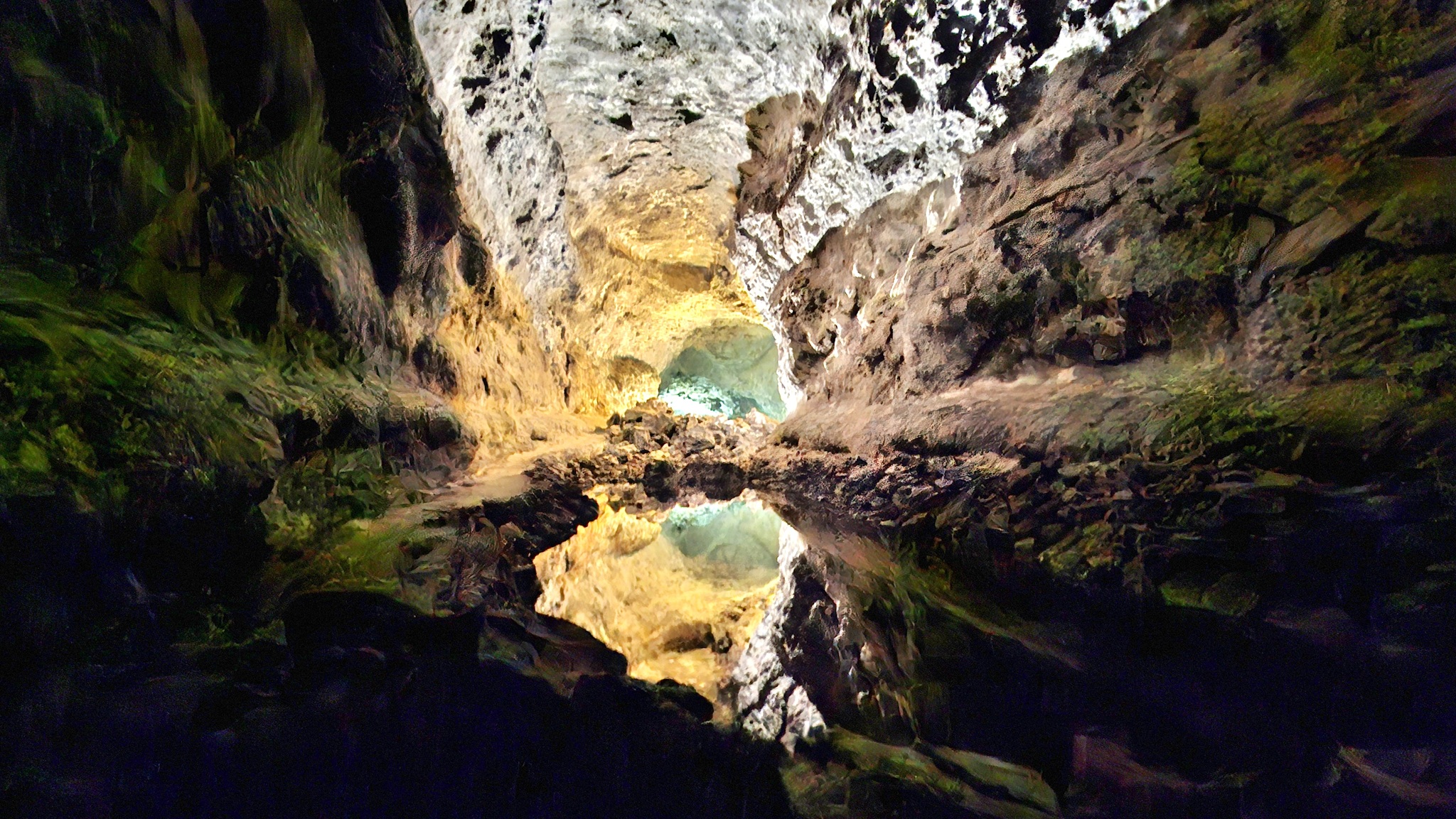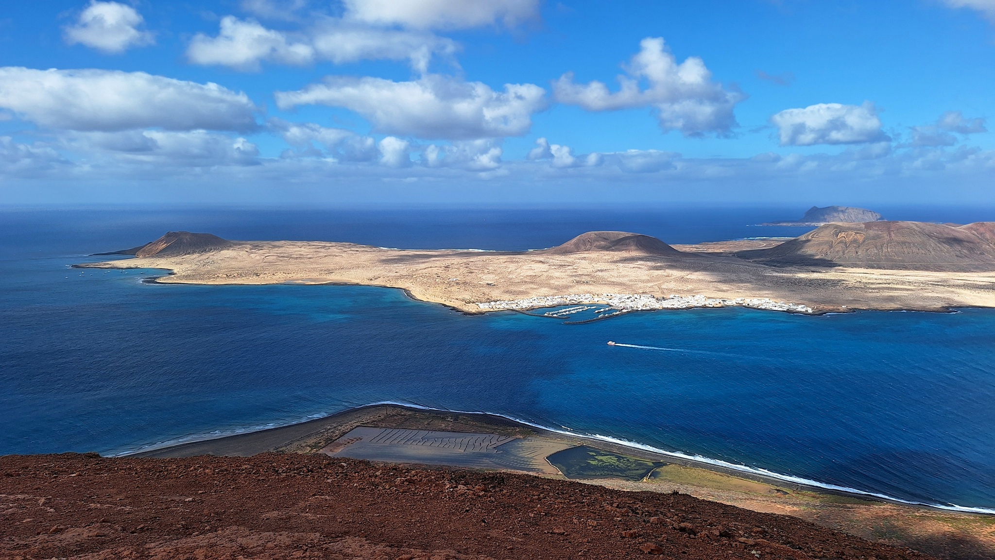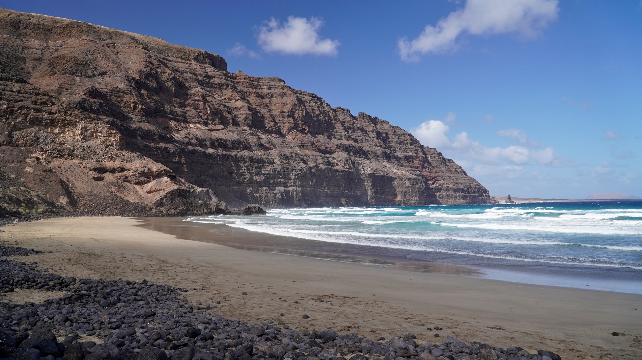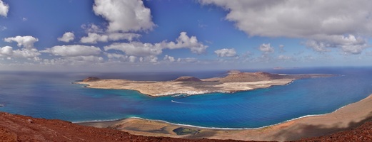 Am Morgen sitzen wir bereits bei Sonnenaufgang am Frühstückstisch und genießen das milde Wetter. Dann starten wir in Richtung Teguise. Bevor wir den Ort erreichen, machen wir noch schnell einen Stopp in der Queseria "El Faro", wo wir uns mit dem leckeren lokalen Ziegenkäse eindecken. Via Teguise fahren wir entlang der LZ-404 zu den skurilen Felsformationen von Los Roferos. Diese bieten tolle Fotomotive und erinnern uns etwas an den Bco. de Las Vacas auf Gran Canaria. Dann fahren wir weiter zu der Vulkanröhre der Cueva de los Verdes. Bereits gestern haben wir online unsere Tickets gebucht, da es hier keine Tageskasse gibt und man zwingend reservieren muss. Dann geht es hinab in die Höhle, wo wir in ca. 50 Minuten an einer Führung teilnehmen. Wieder zurück am Tageslicht fahren wir weiter gen Norden und machen an der Badebucht Caletón Blanco einen nächsten Fotostopp. Dann sind es nur wenige Minuten und wir erreichen Órzola, den nördlichsten Ort der Insel, der durch seinen Fährhafen, welcher die Verbindung zur kleinsten Insel der Kanaren - La Graciosa - bildet, bekannt ist. Hier bummeln wir durch den Ort und fahren dann noch ein kurzes Stück zum wilden Strand Playa de la Canteria weiter. Baden kann man hier eher weniger aber dafür erleben wir eine grandiose Szenerie. Dann führt uns die Fahrt hinauf in Richtung Mirador del Rio. Wir besuchen nicht den Aussichtspunkt selbst sondern erleben das gleiche Traumpanorama auf La Graciosa nur wenige Meter weiter an einer kleinen engen Straße, welche nach Haria führt. In Haria machen wir wieder eine Pause und schlendern durch den Ort. Über Los Valles und Teguise fahren wir dann nach Arrecife, wo wir noch ein paar Besorgungen im Mercadona erledigen. Bevor wir dann in unsere Finca Isabel zurückfahren, geht es noch zur nahen Bodega "El Grifo", wo wir eine Flasche leckeren Inselwein erstehen, welchen wir uns dann zum Sundowner in unserem Quartier schmecken lassen.