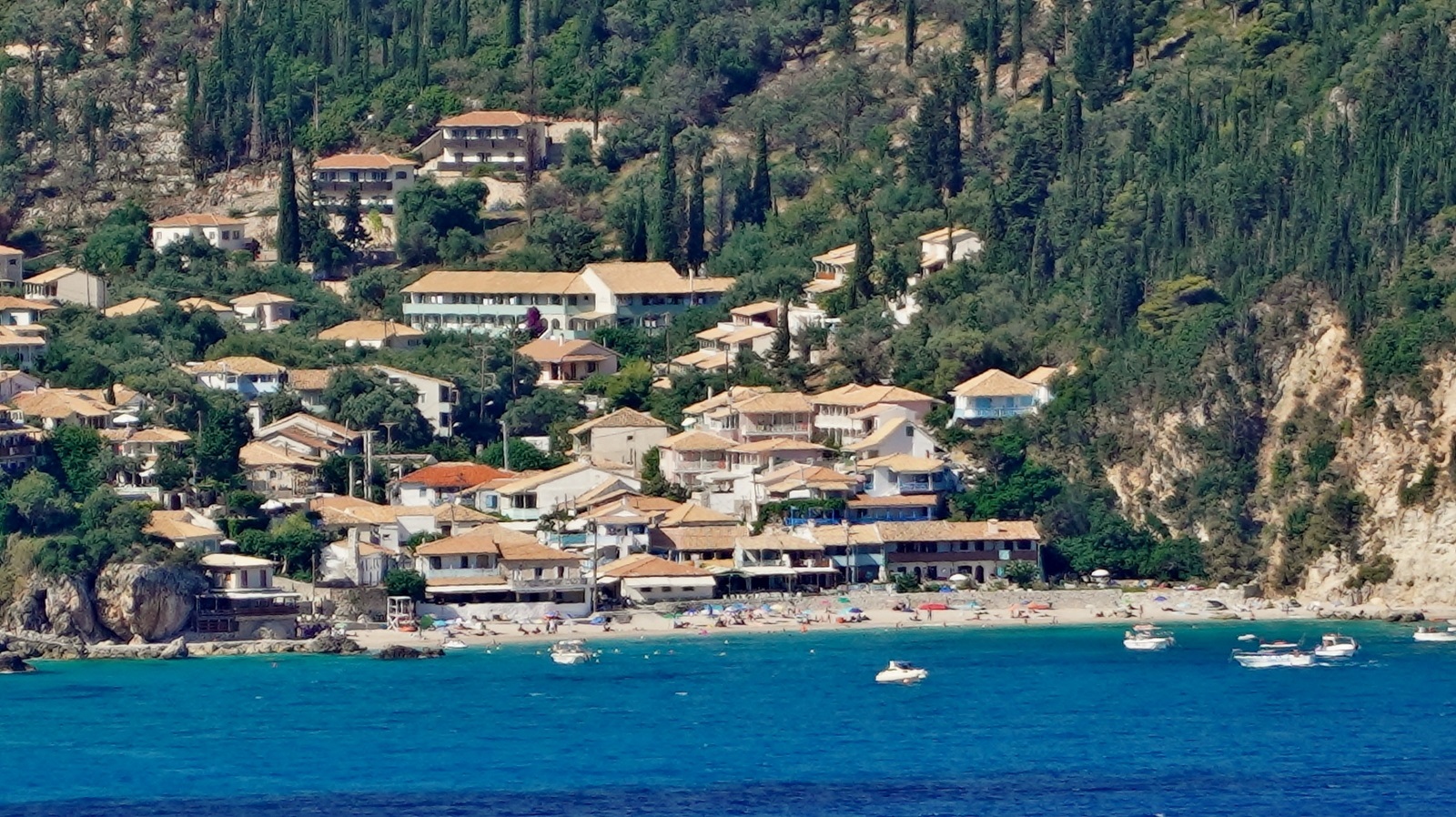 Wie so oft im Urlaub, beginnen wir kurz nach 07:00 Uhr den Tag mit einem Bad in unserem privaten Pool. Dann lug bereits die Sonne über die Berge und so genießen wir das Frühstück auf der Terrasse. Dann fahren wir hinüber zum Kathisma Beach. Dieser vielgepriesene Strand ist zwar von seiner natürlichen Kulisse wirklich bilderbuchmäßig, jedoch bietet er mit seiner Liegen- und Sonnenschirmparade eher Rimini-Feeling. Das ist definitiv nicht "unser" Strand und so fahren wir weiter nach Kalamitsi, wo eine teilweise rustikale Serpentinenstraße über ca. 5km hinunter zum Kavalikefta Beach führt. Nachdem wir bisher immer in der Nebensaison hier waren, ist es derzeit deutlich voller. Trotzdem ist es hier deutlich besser als am benachbarten Kathisma Beach. So verbringen wir den Vormittag am Strand und genießen das klare türkisfarbene Wasser. Da wir uns nicht gleich am ersten Tag zu intensiv der Sonne aussetzen wollen, brechen wir gegen Mittag auf und fahren weiter nach Süden. Nach einem Abstecher zum Ammousa Beach drehen wir um und fahren nach Vassiliki. Hier fahren wir entlang der Tavernen , welche sich sehr zahlreich am Hafen entlang ziehen. Dann gehts es zurück ins Quartier, wo wir uns erst einmal im Pool erfrischen. Im Nachmittag fahren wir dann hinunter nach Agios Nikitas, wo wir durch den Ort bummeln und in der Taverna "Maistros" zu Abend essen.